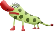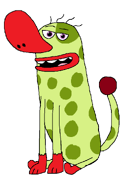 Busho is an imagimal, he has green skin with dark green spots all over his body and also has a huge red nose and red lips, as well as a tail and red feet.